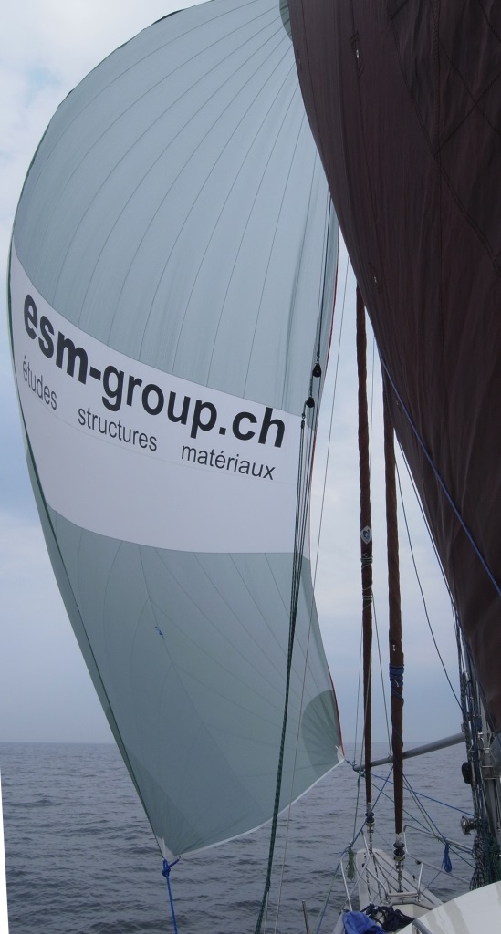 Nous avons effectué les premiers tests avec le spinnaker. Les résultats sont concluants. En vent de travers par un petit 2 BF, la vitesse s’est approchée de celle du vent réel. Les dimensions de la voile mériteraient d’être augmentées de 0.5 à 0.8 m sur la hauteur d’environ 2 m sur la largeur. Il devrait pouvoir présenter une surface d’environ 90 m2. Le spinnaker a été ressorti à plusieurs reprises compte tenu des faibles conditions de vent à l’occasion de cette première semaine. C’est décidé, KeepKeen II mérite un spinnaker symétrique taillé à sa mesure.