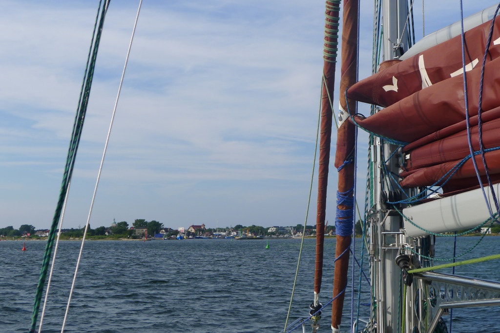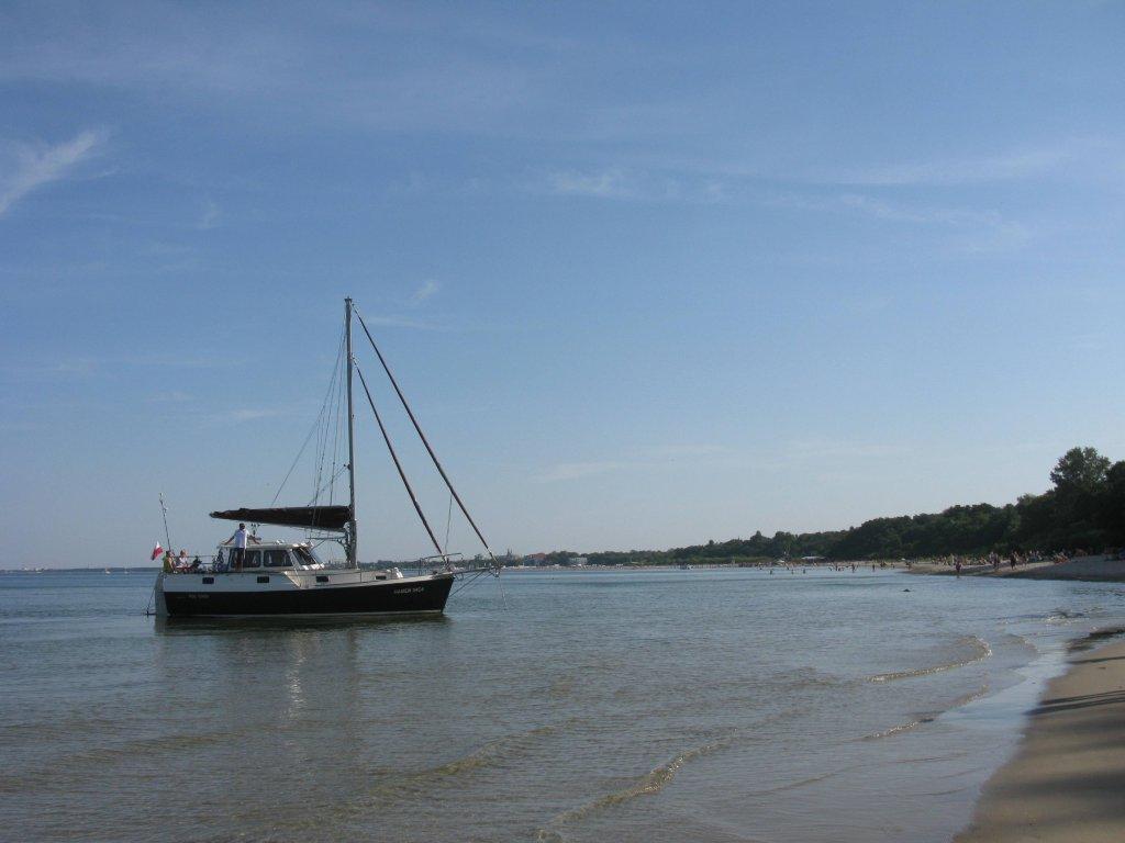 Le jour prévu pour le départ, il souffle un vent d’Ouest de 6 BF. Peu encourageant, compte tenu qu’il faut commencer notre voyage en direction de l’Ouest. Les prévisions météos indiquent que le vent va progressivement tourner vers le Sud durant trois jours. Idéal, nous reportons alors d’un jour notre départ. C’est donc le vendredi 16 août à 18 hrs que nous larguons les amarres. Le premier tronçon, SOPOT –HEL peut se faire au grand largue sous-spi par 3 BF. Passé HEL, nous rangeons le spi et longeons la côte Polonaise de nuit, en direction de l’Ouest. Nous n’avançons pas beaucoup car le vent a fléchi. Toutefois, comme prévu par la météo, il s’oriente progressivement vers le Sud.