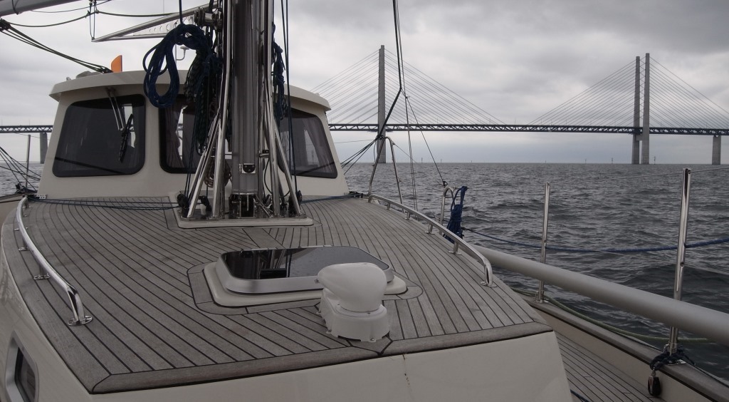 Nous reprenons la mer le lendemain matin avec un vent de Sud-Ouest de 3 à 4 BF. Au programme, le passage sous le pont de l’Øresund. Dommage, le ciel gris. Le plaisir et l’émotion sont tout de même au rendez-vous. La remontée du détroit de l’Øresund nécessite de la vigilance. Le trafic maritime est important et certains passages sont étroits. Un équipier à la navigation est nécessaire pour lire les cartes, identifier les obstacles et donner les caps au barreur.