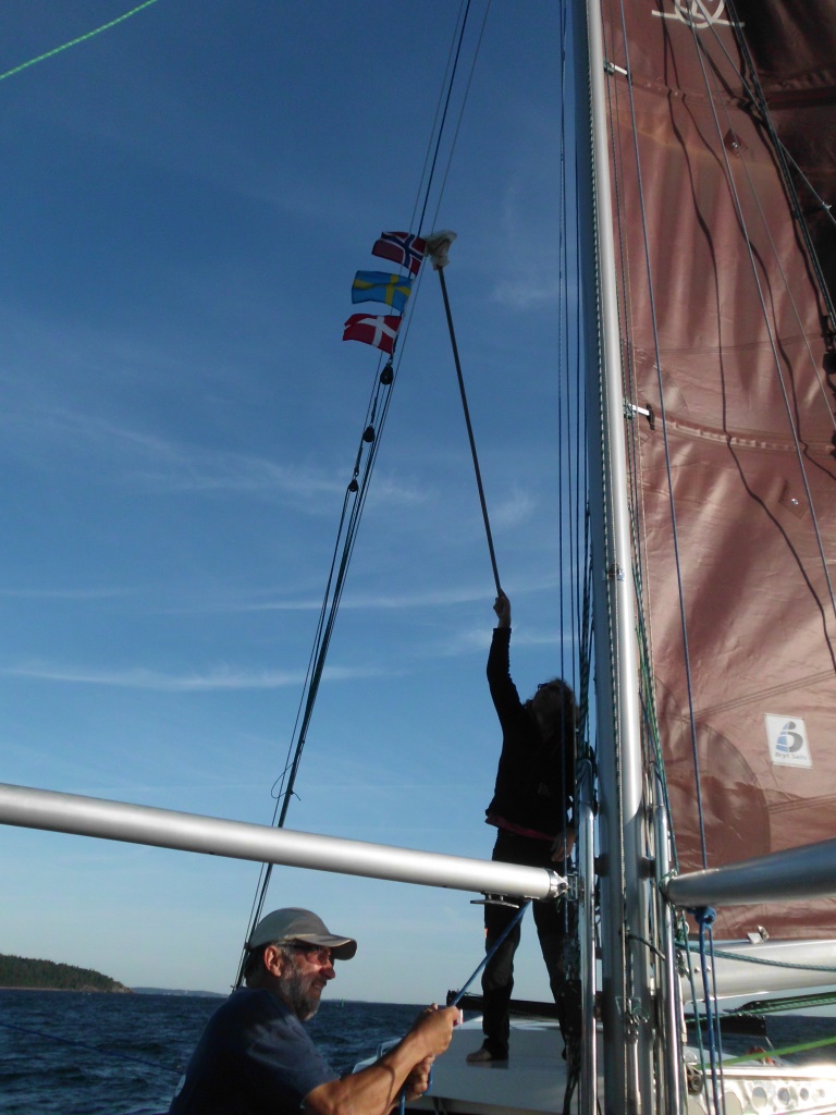 Nous atteignons l’entrée du fjord d’Oslo en matinée par vent arrière. Tout le monde est d’aplomb. C’est l’occasion de compléter les pavillons au mât et d’envoyer le spinnaker. Le fjord est réputé plus facile à monter qu’à descendre. Le vent du sud est dominant. Le paysage et le type de navigation ressemblent à nos lacs. Des vallons, des montagnes et des villes. Des côtes tout de même plus découpées, des îles, des rochers et des navires marchands en sus. Par vent arrière et un spinnaker sur deux tangons, la navigation n’est pas trop difficile à gérer. C’est l’occasion de discussions et de projets entre amis. Nous nous arrêtons à Drøbak pour nous préparer un bon repas, prendre une douche et passer la nuit sans quarts.