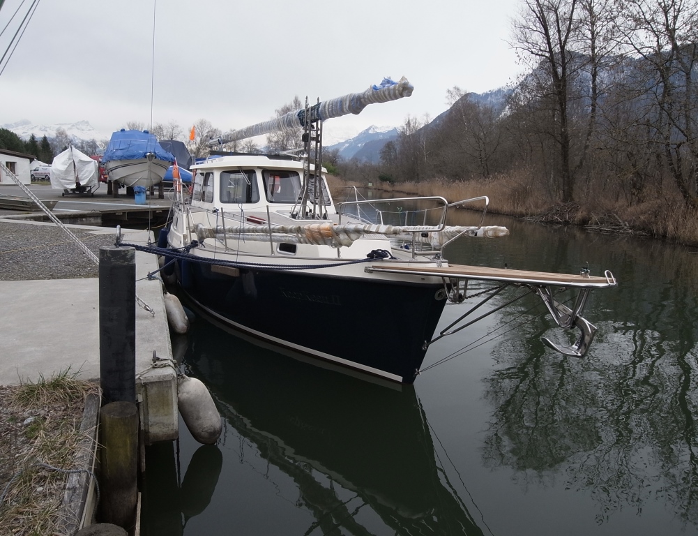 Il a fallu tout de même près de 6 heures pour remonter le gréement, qui avait été complètement défait pour faciliter le transport et protéger les pièces les plus sensibles. Ça été l’occasion de refaire l’exercice du basculement du mât sans l’aide d’une grue. Le bateau est spécialement conçu pour cette opération, afin de permettre de remonter les canaux sans une fastidieuse planification des opérations de dépose du mât. Notre bateau a été contrôlé par le service de la navigation le vendredi 31 janvier 2014, puis a été déplacé au Bouveret, son port d’attache.