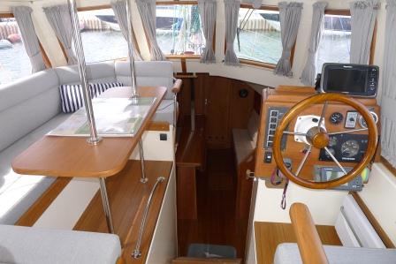 Trois jours de navigation entre 1 et 6 Bf. Les conditions étaient idéales pour démontrer les aptitudes du Haber 34C4. Le confort par tout temps est assuré avec le salon de pont. Entre les manœuvres, l’équipage peu s’y réfugier à l’abri du vent. La visibilité sur le plan d’eau est assurée. La stabilité de route est obtenue en réglant les 4 dérives. La barre peut être lâchée sans nécessiter un autopilote. A 6 Bf le sentiment de sécurité est indéniable.