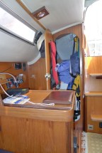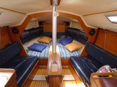 La visite avait pour principal objectif d’affiner certaines options et le choix des finitions. Il va s’agir de la première version du HABER 34C4. Le programme est ambitieux pour un voilier de cette taille. Pour le poste de pilotage extérieur, il a été décidé d’opter pour une barre- franche. Les sensations sont meilleures pour guider le réglage des quatre plans antidérive. Ceux-ci permettent alors une grande stabilité de route, quelques soit les allures à telle point que la barre peut être lâchée. Une barre franche est également moins gourmande en place dans le cockpit. Le couplage avec le poste de pilotage intérieur et l’autopilote s’en trouve aussi simplifié. Le moteur sera à axe horizontal, dériveur intégral oblige. L’arbre sera interrompu au droit du passage à travers la coque par un système antivibration. Des échantillons ont été présentés pour se déterminer sur le choix des matériaux et couleurs des emménagements intérieurs.