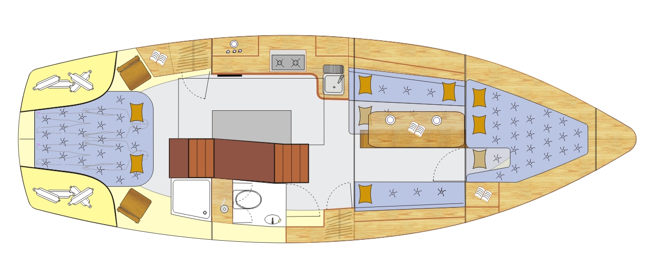 Notre HABER 34C4 a été mis à l’eau au chantier naval du Vieux-Rhône le 29 janvier 2014. Après une saison 2013 longue de 8 mois et cumulant près de 100 jours de navigation, il a transité trois semaines au chantier naval HABER pour être révisé et préparé en vue du salon nautique de Düsseldorf. C’est la troisième fois qu’il y a été présenté. Des visiteurs des années précédentes sont venus voir le résultat final. Le projet est abouti dans les moindres détails. Des mains courantes ont été ajoutées dans le carré pour faciliter les déplacements en cas de mer formée. Le fond du cabinet-douche a été retravaillé pour améliorer le confort d’utilisation. L’hélice a été changée afin de réduire les turbulences lors d’une utilisation à haut régime et améliorer encore la vitesse de croisière au moteur. Dans sa configuration finale, le HABER 34C4 atteint sous voiles ou au moteur sans difficultés sa vitesse de coque d’environ 7 nœuds.